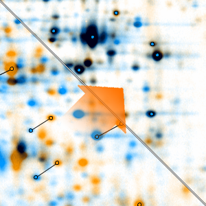 Here you see a combined image that is made from two gels. One is colored in orange, the other one in blue. In the dual channel image without warping it is hard to find corresponding spots and do comparisons of expression patterns.